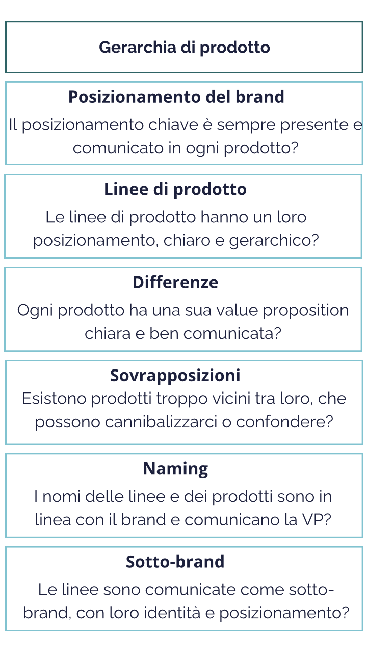 In generale, ma soprattutto quando i prodotti sono diversi e divisi per molteplici linee prodotto, consigliamo ai brand nostri clienti di definire l’essenza del brand, che dovrà essere sempre comunicata per ogni prodotto e poi lavorare sulla coerenza della gerarchia di prodotti. Ecco alcune domande/aree di attenzione che esploriamo insieme ai brand, quando lanciamo strategie di posizionamento e di comunicazione sia delle linee prodotto che del brand e dei vari sotto-brand: