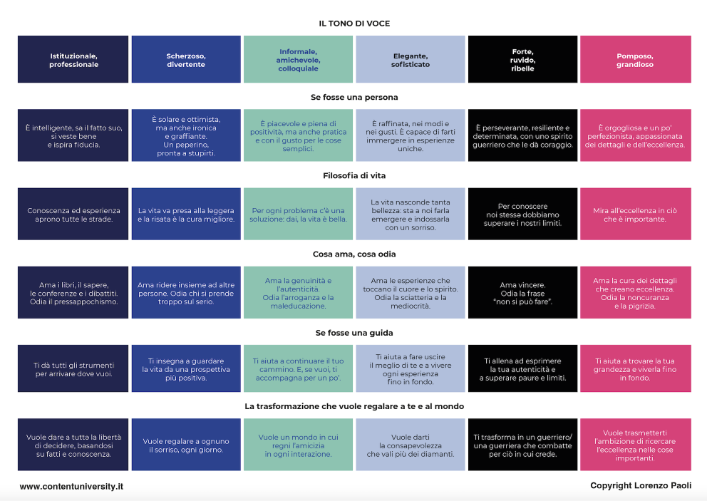 Nella definizione del tono di voce, raccomandiamo le aziende, prima di tutto, di definire tre caratteristiche che, secondo loro, definiscono con cura la personalità dell’azienda. Il tono di voce però deve riflettere, lo abbiamo visto, anche il posizionamento dell’azienda: per questo dobbiamo capire come possiamo esprimerlo con le parole.