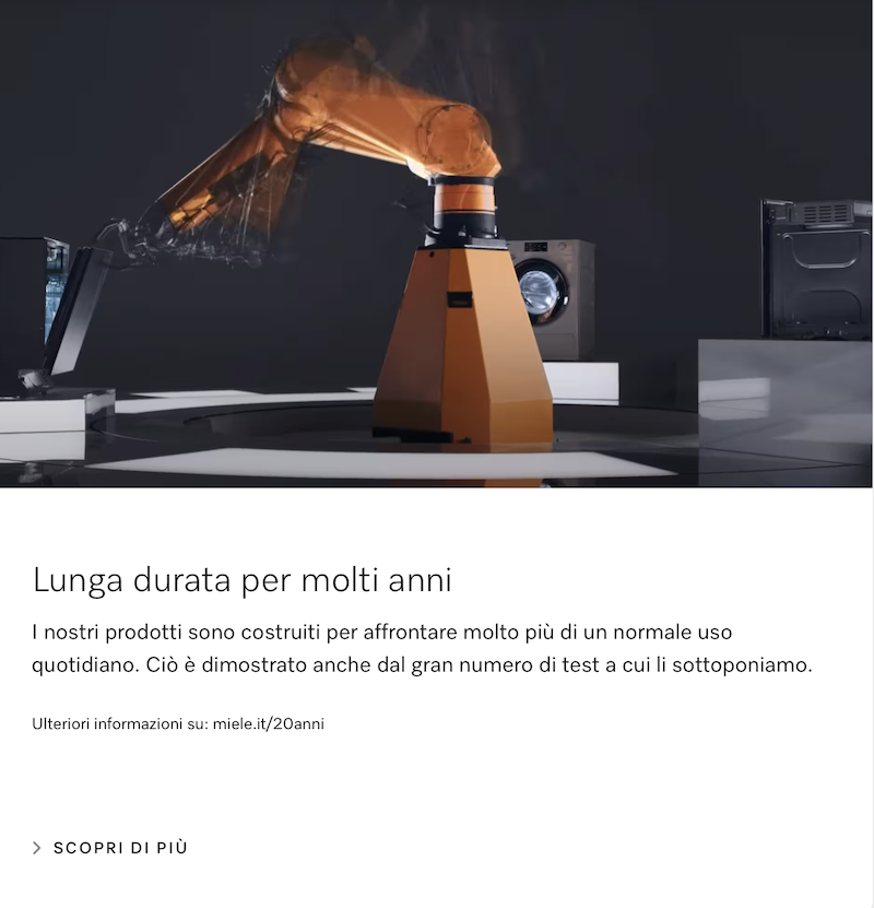 Come vediamo in quest’immagine, sopra, sempre dal sito Miele, il concetto di “durata per molti anni” è unito alle prove che Miele offre e che cementano la percezione che la persona ha del prodotto. Ovviamente, questa è una promessa che l’azienda deve mantenere.