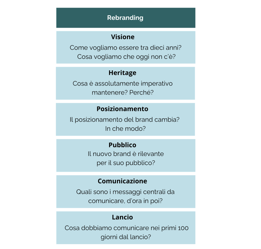 Un rebranding non deve essere considerato come un cambio di comunicazione: all’interno, il nocciolo è il posizionamento strategico e un ragionamento su come questo posizionamento cambia e, quindi, come sarà espresso dal nuovo brand.